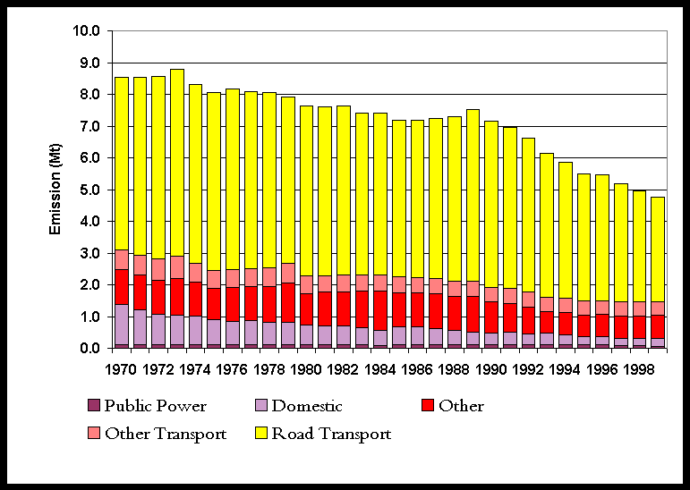 The most important source of CO is road transport and in particular petrol driven vehicles. Emissions from road transport fell only slightly between 1970 and 1990 but in recent years have declined more significantly. This is due primarily to the increased use of catalytic converters and to a lesser extent to fuel switching from petrol cars to diesel cars. The emissions from off-road sources includes portable generators, fork lift trucks, lawnmowers and cement mixers. The estimation of emissions from such machinery is very uncertain since it is based on estimates of equipment population and annual usage time.