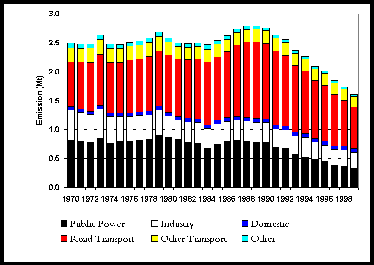 Since 1970 there has been a reduction in total NOx emissions of 36%, however this decrease in emissions has not been constant (Figure 5.1). Up to 1984 the NOx emission profile was relatively flat with small peaks in 1973 and 1979, as seen previously for CO2, which were due largely to the cold winters in those years. However, from 1984, emissions rose markedly as a result of the growth in road traffic reaching a peak in 1989 (Table 5.3). Since 1989, total emissions have declined by 43% as a result of a 56% reduction from power stations and 46% decrease from road transport.
