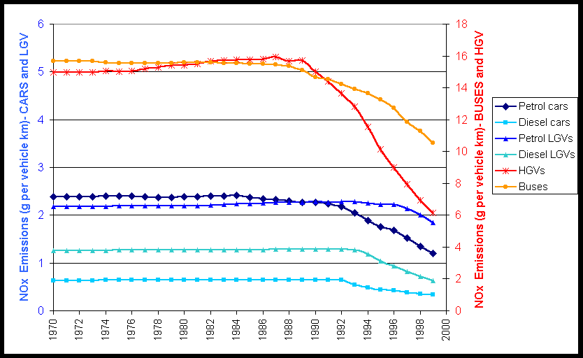 Figure 5.4 shows the average NOx emissions per vehicle kilometre for different vehicle types (NOTE: two different Y scales are used). Various emission regulations on new petrol cars which have come into effect in stages since 1976 have led to the gradual reduction in emission rates from petrol cars. The more rapid decline in emissions from 1992 is due to the penetration of cars fitted with three-way catalysts. Limits on emissions from diesel cars and Light Goods Vehicles (LGVs) did not first come into effect until 1993/94. Overall emissions per kilometre from Heavy Goods Vehicles (HGVs) showed a small rise from 1970-1987 due to the increasing usage of larger HGVs for freight movement. Limits on emissions from HGVs first came into effect in 1988 leading to a gradual reduction in emission rates as new HGVs penetrated the fleet, accelerated by tighter limits on emissions from new HGVs in 1993/94.