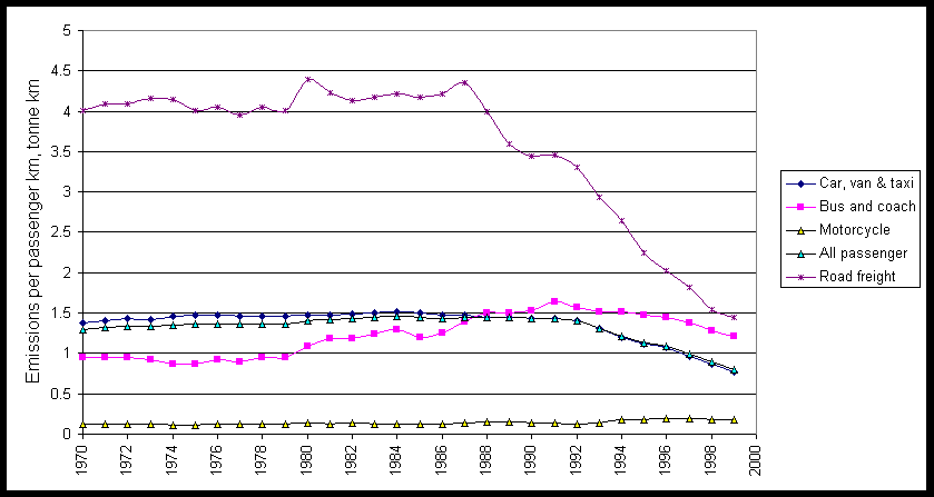 Figure 5.5 shows emissions per passenger km and by tonne km of freight. Technological improvements to HGVs give rise to approximately half the emissions per tonne of freight moved in 1998 compared with 1970. Emissions per passenger km from cars, vans and taxies have significantly decreased since 1970 due mainly to the introduction of the catalyst in 1992 now penetrating the car fleet. Per passenger km emissions from buses and coaches have increased from 1970 to 1993. This was due to the gradual decrease in occupancy rate of buses and their under utilisation over this period. Since 1993, this rise in per passenger km emissions has been halted by the penetration of buses meeting tighter emission standards into the fleet.